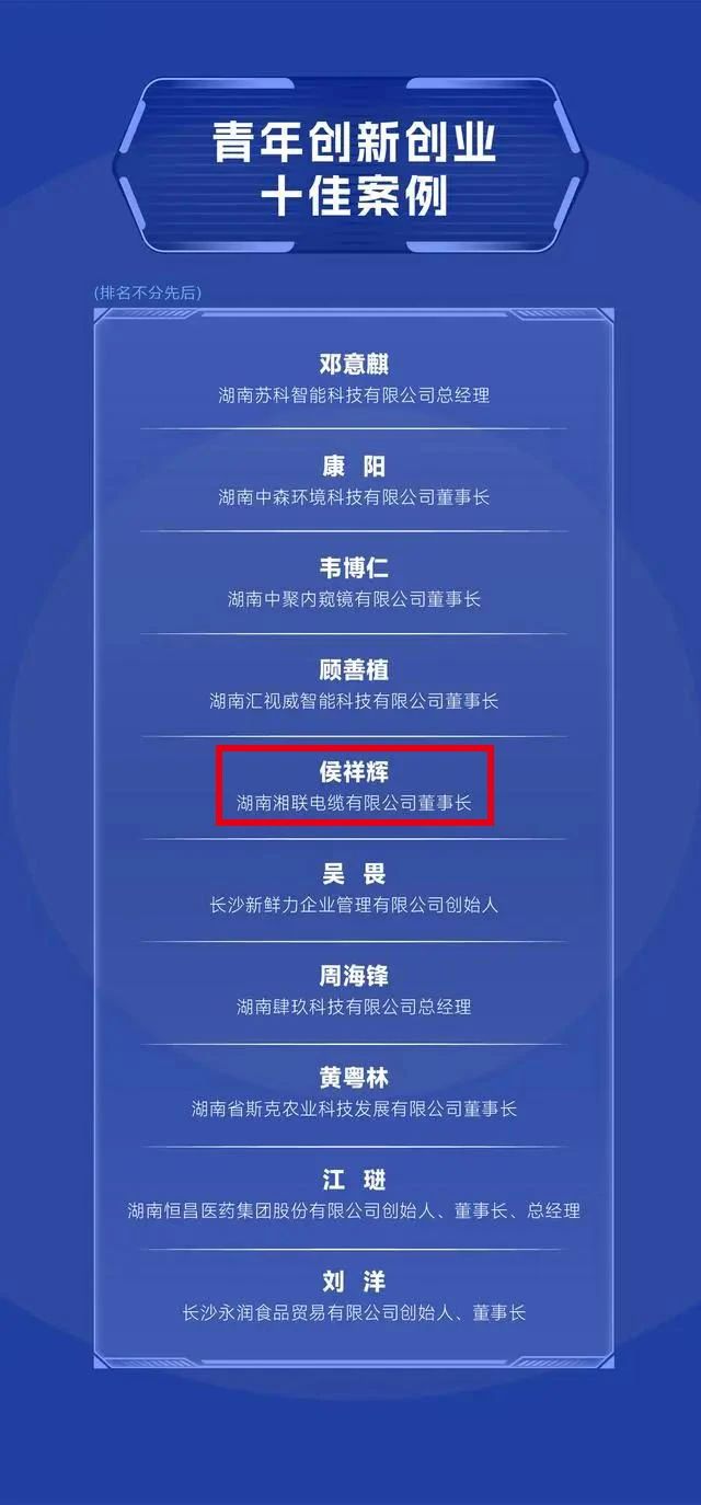 活動現場,發布了發展新質生產力十佳案例、青年創新創業十佳案例、優化營商環境十佳案例3張榜單,湘聯電纜董事長侯祥輝光榮上榜青年創新創業十佳案例。